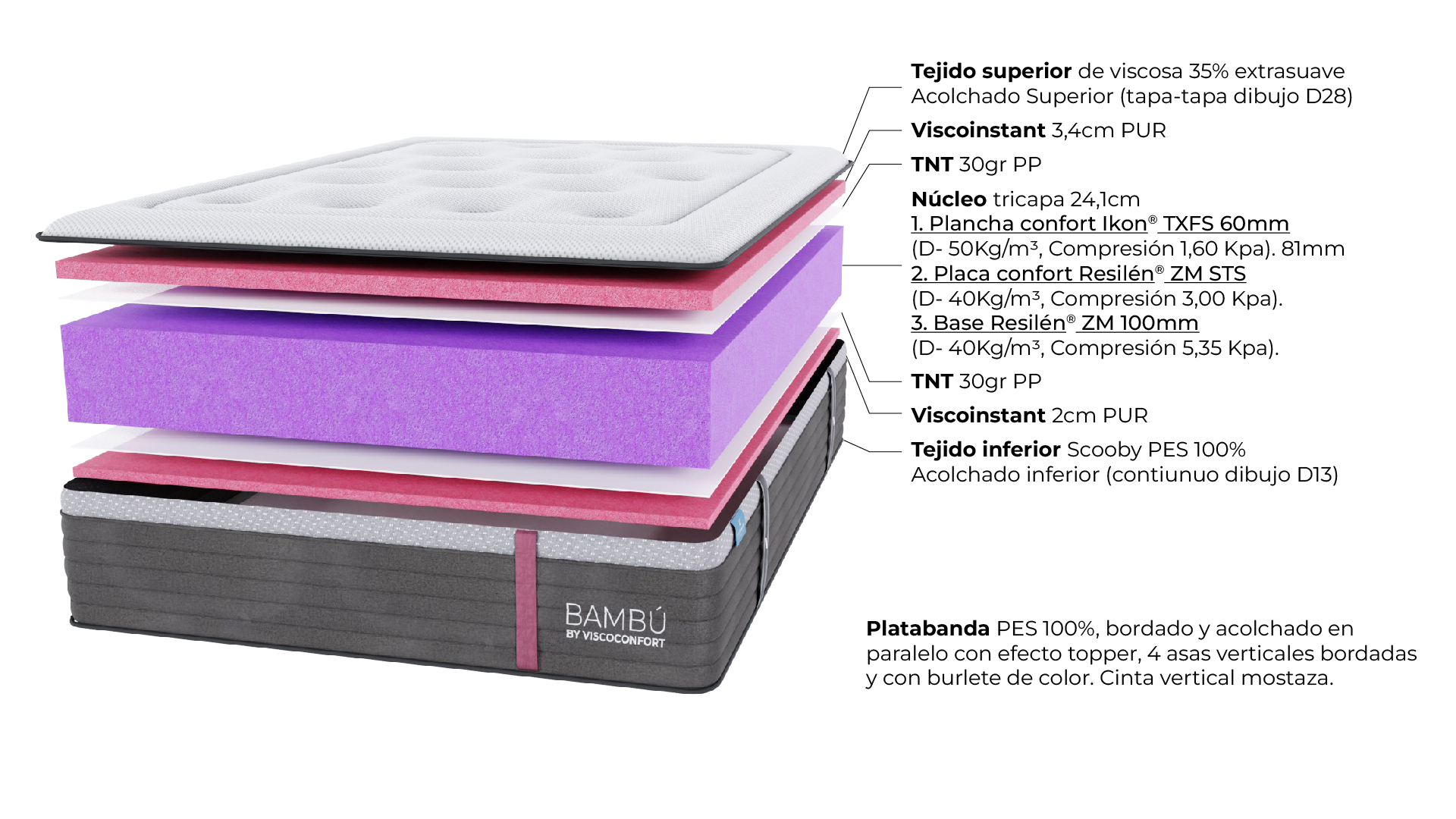 La tapa superior acolchada en tejido de PES 100% y 2 cm de PUR Viscoinstant suave y transpirable proporciona un toque de elegancia y frescura.